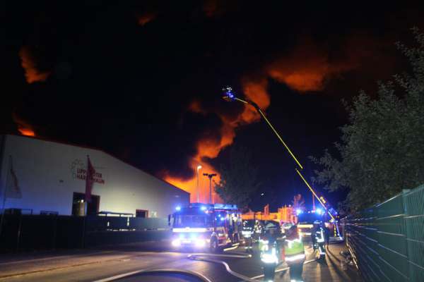Um 23.44 Uhr wurde die hauptamtliche Wachbereitschaft der Feuerwehr Lippstadt zu einer automatischen Feuermeldung zu einem Hartschaumverarbeiteten Betrieb an der Bertramstr. alarmiert. Während der Anfahrt war eine starke Rauchentwicklung sowie Flammenschein über dem Gewerbegebiet „Am Wasserturm“ zu sehen. Bei Eintreffen der Feuerwehr brannte der Betrieb in voller Ausdehnung. Umgehend wurden weitere Löschzüge zur Einsatzstelle alarmiert. Kurz nach Eintreffen der ersten Kräfte kam es zum Einsturz einer Halle im Bereich der Produktion.