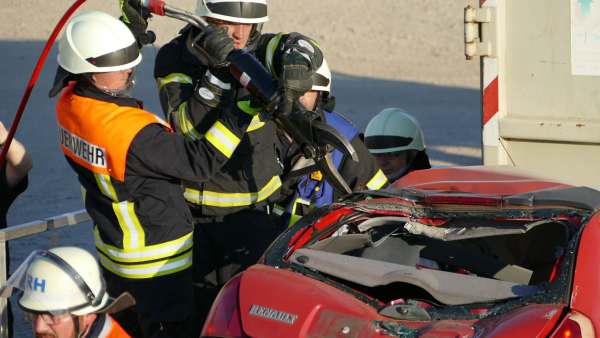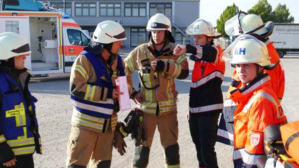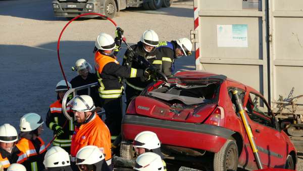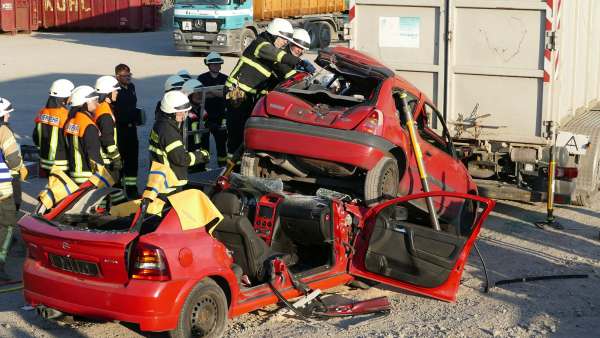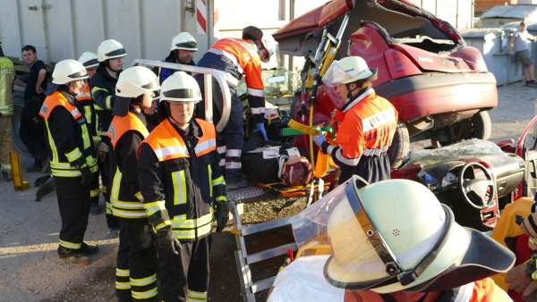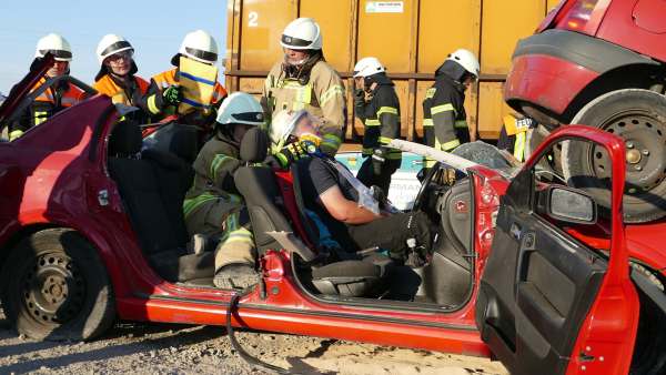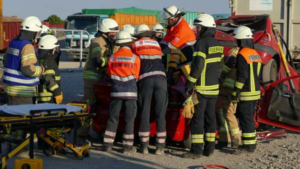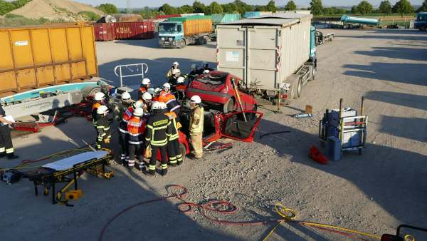 Für Hochspannung sorgte auch Dominik Müller (Fachberater ABC Feuerwehr Rüthen und Pyrotechniker) der mit plötzlichen Detonationen, mehreren Rauchbomben und einem Entstehungsbrand die Retter in Atem hielt. Abschnittsbildung, Zusammenarbeit mit dem Rettungsdienst, Sichern des Containers und des PKW mit einem hydraulischen Abstützsystems, die Öffnung der Fahrzeuge nach Weisung des Rettungsdienstes und letztendlich die Befreiung und Rettung der drei eingeklemmten Personen wie auch die Sicherstellung des Brandschutzes und die Bekämpfung eines Entstehungsbrandes hielten die 45 Aktiven der Wehren und der Malteser in Atem.