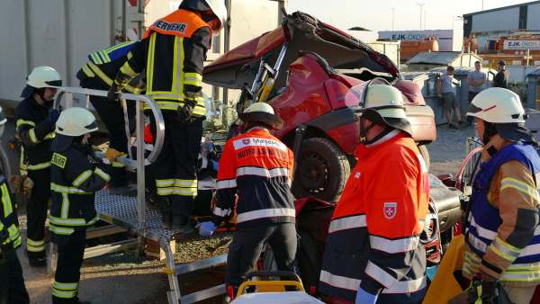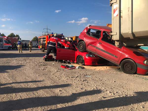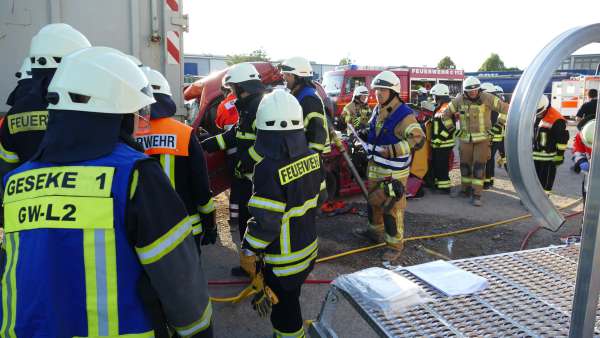 Mit der Meldung „Verkehrsunfall, drei Fahrzeuge, darunter ein LKW, mehrere Personen sind eingeklemmt“ wurden jetzt 45 Aktive der beiden Löschgruppen und der Malteser aus Geseke zum Übungseinsatz gerufen. Den Rettern bot sich ein Bild, das man sonst so nur von schweren Verkehrsunfällen von Autobahnen kennt. Ein PKW war unter ein Containerfahrzeug gefahren, ein weiterer PKW war aufgeprallt und hatte sich unter das Unfallfahrzeug geschoben und dieses im Heckbereich angehoben.