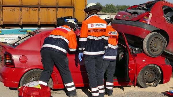 Um die Personen zu befreien, mussten zudem von den PKW ´s Türen und Dach entfernt werden. Das Team der Geseker Malteser unter der Leitung des Notfallsanitäters Tim Tegetmeyer hatte alle Hände voll zu tun, um die Mimen medizinisch zu versorgen. Gleichzeitig diente das Fahrzeug auch zur Eigensicherung der übenden Kameraden.