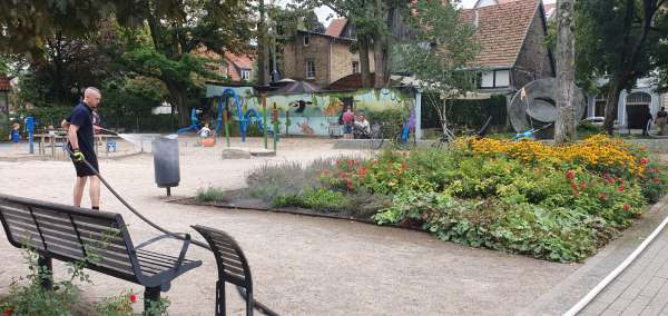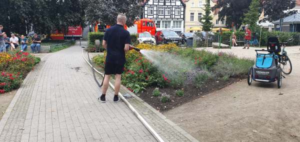 Aufgrund der anhaltenden Trockenheit schafft es der städt. Baubetriebshof nicht, alle Grünanlagen zu bewässern. Seit heute Abend unterstützen die Kameraden aus dem Löschzug 1 mit einem Tanklöschfahrzeug (5.000 Liter Wasser) indem Sie nach Feierabend ehrenamtlich die durch die Stadtverwaltung vorgegebenen Grünanlagen bewässern.
