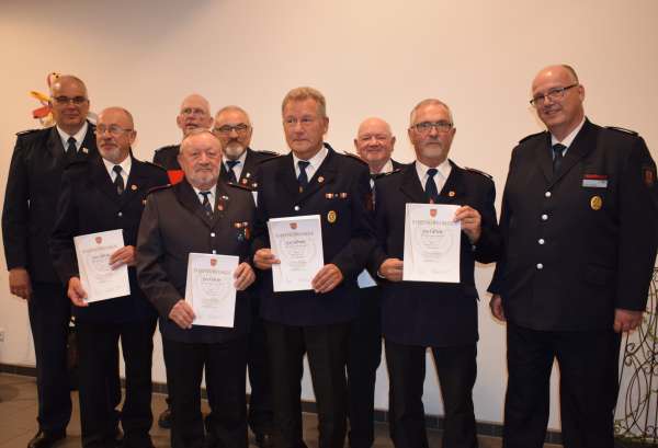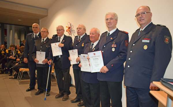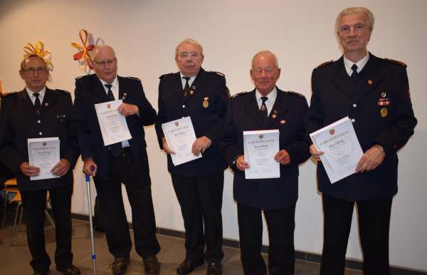 Eine besondere Ehrung wurde einigen Feuerwehrmännern zuteil, die der Wehrführer Bernd Peterburs für 50-, bzw. 60-jährige Zugehörigkeit zur Freiwilligen Feuerwehr Lppstadt auszeichnete: