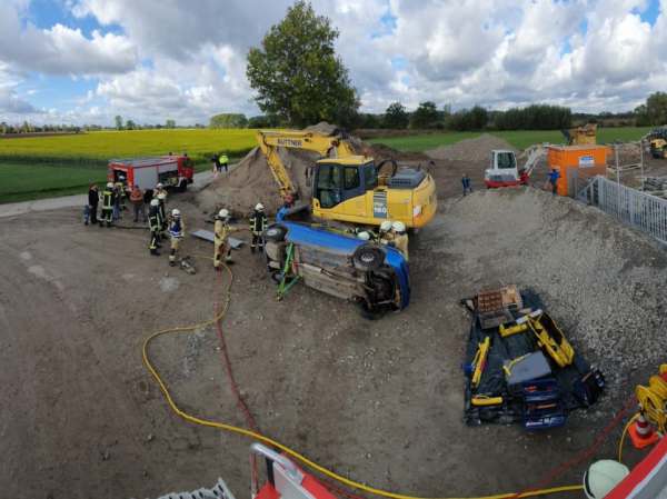 Nach erfolgreichem Übungsende wurden die Fahrzeuge gemeinschaftlich Einsatzbereit gemacht und zum Gerätehaus gefahren. Kaum dort angekommen folgte die nächste Einsatzmeldung der Übungsleitung über Digitalfunk: „Büttner Tiefbau GmbH – VU Pkw gegen Baumaschine“. Ähnlich wie bei einem Brandeinsatz wurden nach dem Eintreffen der Löschgruppe zunächst die Einsatzstelle erkundet, die Fahrzeugaufstellung bestimmt und der Einsatzbefehl erteilt. Bei dieser Übung waren zwei Personen im Fahrzeug eingeklemmt und ansprechbar. Da das verunfallte Fahrzeug auf der Seite lag und von der Baumaschine eingeklemmt war, gestaltete sich die Rettung der Personen als knifflig. Bei verletzten und ansprechbaren Personen ist eine ständige Betreuung unerlässlich, um sie einerseits zu beruhigen und um andererseits mögliche Verschlechterungen ihres Zustandes rechtzeitig zu erkennen.