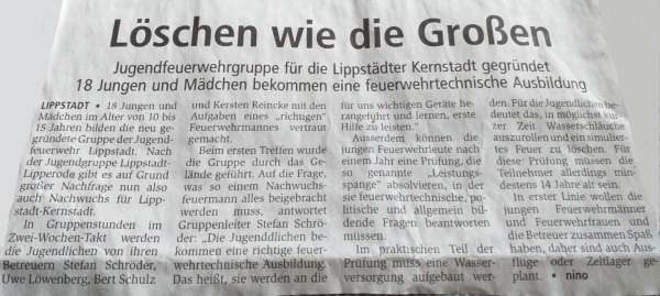 Am 11.05.2001 wurde die Jugendfeuerwehr Lippstadt Kernstadt mit Hilfe der Jugendwarte/Betreuer Stefan Schröder, Uwe Löwenberg, Bert Schulz und Kersten Stracke gegründet. Unter dem Motto „Löschen wie die Großen“ waren vom Beginn an 18 Mädchen und Jungen dabei.