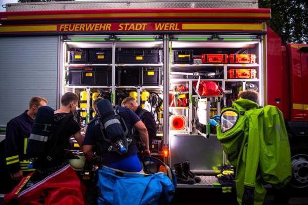 Dann ging es an die Praxis auf dem neuen Übungsgelände der Feuerwehr Werl. „Zuerst wurde an zwei Abenden ohne die Chemikalienschutzanzüge (CSA) die praktische Handhabung der verschiedenen Geräte zum Abdichten und Auffangen von Chemikalien und für das Umpumpen von Gefahrstoffen geübt“, schildert Karsten Korte. Als die Handgriffe saßen, wurden an den kommenden Übungsabenden – zwei Wochen lang kamen die Feuerwehrleute montags, mittwochs, freitags und samstags zusammen – die schweren „CSA“ übergezogen. Allein das Einkleiden in diese Spezialanzüge, die die Einsatzkräfte vor den Gefahrstoffen schützen, benötigt allerlei Übung und vor allem helfende Hände.
