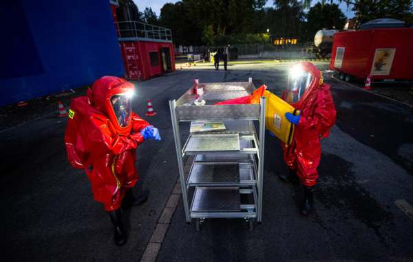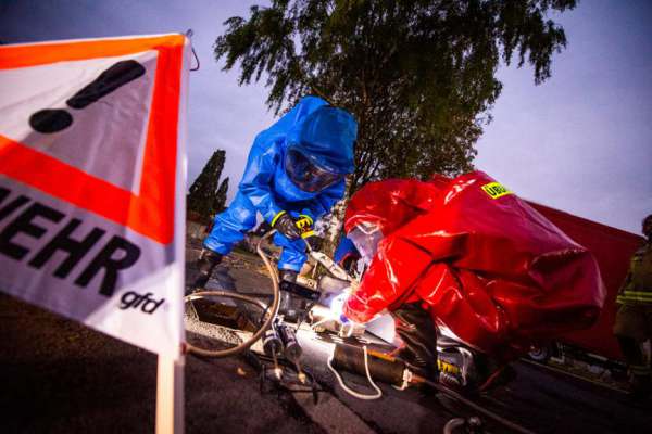 Noch viel wichtiger: das besonnene Entkleiden. Wenn die Anzüge erst einmal im Gefahrstoff-Einsatz waren, müssen sie mit ihren Trägern an der Einsatzstelle den sogenannten Dekontaminations-Bereich durchlaufen. „Hier wurde den Teilnehmern die nötige Sensibilität in Sachen Einsatzstellen-Hygiene vermittelt“, berichtet Karsten Korte.