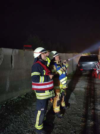 Mit der Rettung eines darunter befindlichen Dummys gilt dann auch dieser Teil der Übung als bestanden. Plötzlich werden noch zwei Personen vermisst. Auch sie werden nach einer kurzen Suchaktion im Gelände gefunden. Zum Abschluss der Übung zieht Zugführer Guido Seiger ein positives Resümee der Übung. Sein Dank und der Dank aller Beteiligten, insgesamt waren 24 Aktive an der Übung beteiligt, gilt Herrn Frese, der seine Werkstatt für die Übung zur Verfügung stellte, der Jugendfeuerwehr für die Darstellung der Verletzten und dem Vorbereitungsteam für die Vorbereitung der Übung.