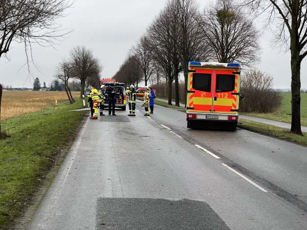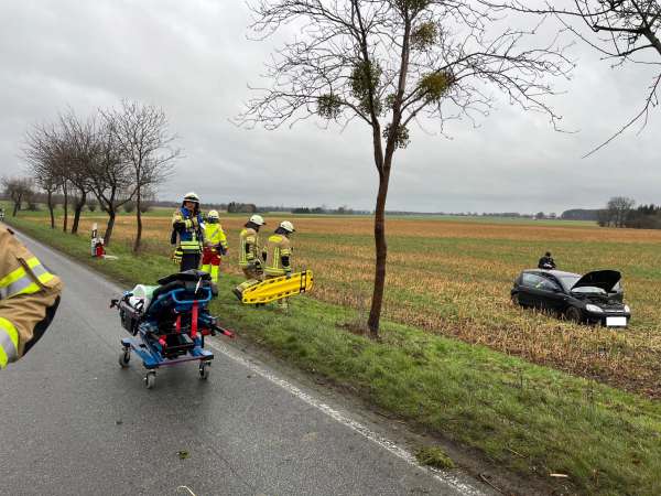 Der Pkw kam ins Schleudern und stieß mit einem Baum am rechten Fahrbahnrand zusammen. Durch die Wucht des Aufpralls wurde das Fahrzeug mehr als 20 Meter auf das angrenzende Feld geschleudert. Das Kind und der Ehemann erlitten bei dem Unfall leichte Verletzungen und konnten nach ambulanter Behandlung wieder entlassen werden.