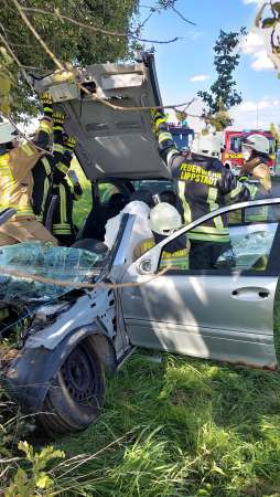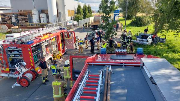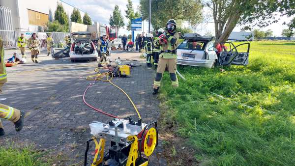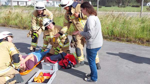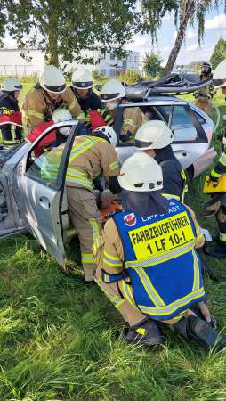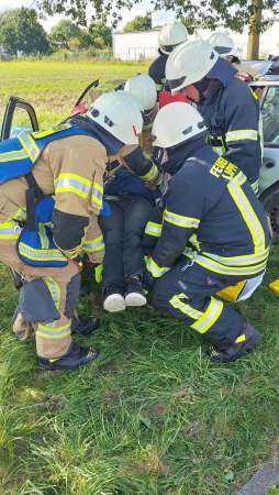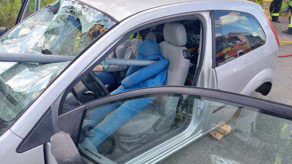 Die fünfte und letzte Übung, hat es dann für Einsatzleiter Julian Kipp nochmal in sich. Ein LKW hat eine Ladung Rohre verloren, eines davon durchschlägt die Scheibe eines nachfolgenden PKW und dringt in den Körper (Dummy) einer Person ein. Ein zweiter PKW versucht auszuweichen und rast gegen einen Baum. Der LKW-Fahrer selbst erleidet einen Schock und muss mit Hilfe der Rettungsplattform aus dem LKW befreit werden. Bei dem Fahrzeug vor dem Baum wird von einer weiteren Gruppe (Stefan Bergmann) das Dach für die Rettung geöffnet und abgeklappt. Mit Hilfe der Rettungsschere gelingt es der dritten Gruppe unter Kathrin Fritsch den von dem Eisenrohr durchbohrten Autofahrer aus seiner Notlage zu befreien.