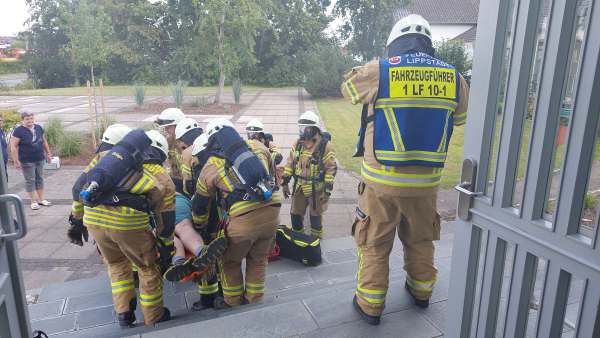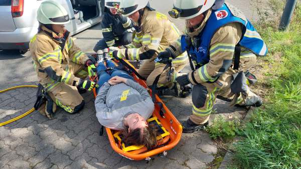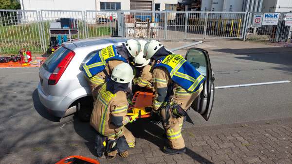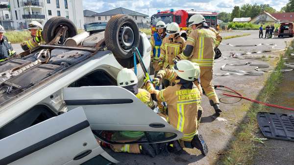Verkehrsunfall, zwei PKW, mehrere Verletzte, mit dieser Meldung werden 35 Aktive des Löschzug 1 zur ersten Übung des Tages gerufen. Vor Ort in Lipperbruch liegt ein PKW auf dem Dach, ein zweiter steht davor. In beiden Fahrzeugen sind Personen eingeschlossen. Bei der Erkundung stellt Einsatzleiter Uwe Löwenberg fest, dass einer der PKW ein E–Auto ist. Kurz danach kommt es bei dem E-Fahrzeug zu einer massiven Rauchentwicklung. Gleichzeitig verschlechtert sich der Zustand der Fahrerin.