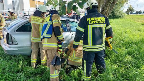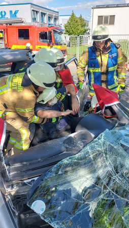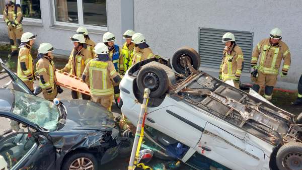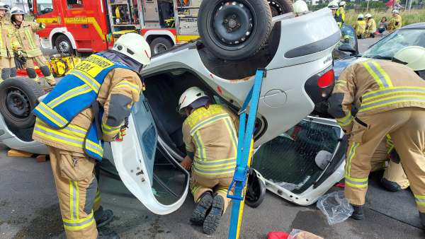Für die Einsatzkräfte heißt es nun eine Sofortrettung der Fahrerin durchzuführen und gleichzeitig mit einem Löscheinsatz eine weitere Reaktion der Hoch Volt Batterieanlage zu verhindern. Bei dem zweiten auf dem Dach liegenden PKW hat eine weitere Gruppe die Erstversorgung des eingeklemmten Fahrers übernommen. Mit dem Spreizer wird das Heck des Fahrzeuges geöffnet und im Anschluss die Rettung des Fahrers durchgeführt.
