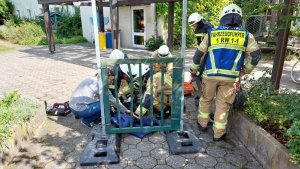 „Ein Kind steckt mit dem Kopf im Gartentor“, mit dieser Meldung werden die Aktiven zum Ev. Gymnasium gerufen. Mit großer Vorsicht gelingt es der Gruppe unter den Argusaugen der Mutter das Kind (dargestellt durch einen Dummy) mit dem Spreizer zu befreien. Zum gleichen Zeitpunkt wird eine zweite Gruppe zum Stadttheater gerufen. Hier hat die Brandmeldeanlage ausgelöst. Vor Ort stellt Gruppenführer Bergmann fest, dass gleich mehrere Melder darunter auch ein Druckknopfmelder fast zeitgleich ohne Grund ausgelöst haben.