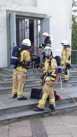 Das sieht ganz anders dann bei dem Einsatz im Ev. Gymnasium aus. Beim Eintreffen ist das Schulgebäude verraucht, eine Person wird vermisst. Sofort schickt Markus Magner einen Trupp in das Gebäude der die vermisste Person rettet. Zeitgleich wird ein Löschangriff vorbereitet. Mit dem Einsatz eines Lüfters, der die vernebelten Räume wieder frei bläst, ist die Aufgabe erfüllt.