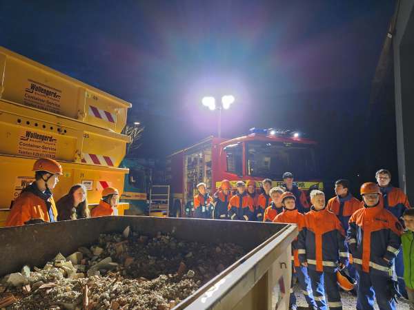 Bei der Übung handelte es sich um einen Unfall auf einem Betriebsgelände mit einer eingeklemmten und einer vermissten Person. Die beiden Personen konnten gerettet/gefunden werden und wurden anschließend bis zur Übergabe an den Rettungsdienst betreut. Die Jugendlichen der Jugendfeuerwehr haben großartige Leistung gezeigt.