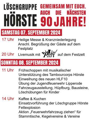 Die Floriansjünger in Hörste stehen ihren Mitmenschen nicht nur im Notfall zur Seite, sondern sind fest im Ort verwurzelt und aktiver Bestandteil der Dorfgemeinschaft und das seit nunmehr 90 Jahren. Diesen Meilenstein möchte die Löschgruppe mit allen Bewohnern feiern und hat für Samstag und Sonntag, 7. und 8. September, ein buntes Programm für die ganze Familie auf die Beine gestellt.
