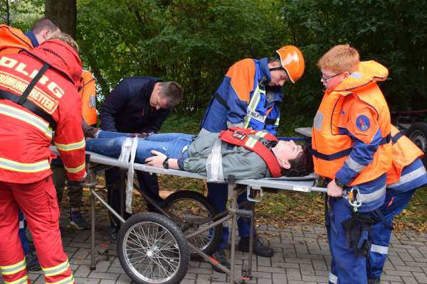 Organisator und Übungsleiter Timo Harbich von der DLRG hatte gemeinsam mit dem ORGA-Team alle Register gezogen, um den Nachwuchsrettern einen spannenden und lehrreichen Tag zu bieten. Verschiedene Aufgaben, wie die Arbeit mit dem Digitalfunk, den Einsatz mit Booten sowie die Suche, die Rettung und die Versorgung von Verletztendarsteller sorgten dafür das die Jugendlichen alle Hände voll zu tun hatten. Auch die Führungsaufgaben wurden mit Bravour gemeistert.