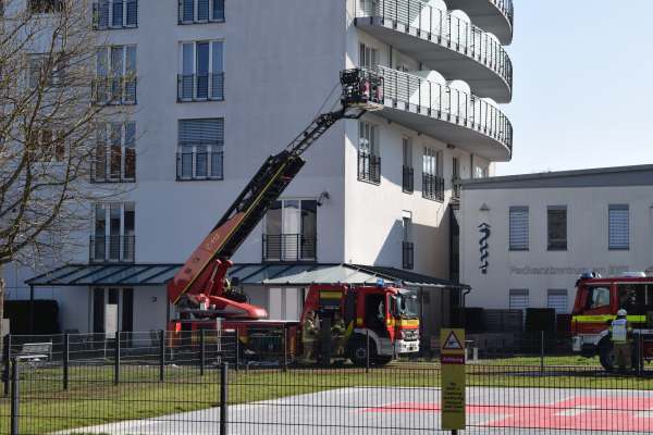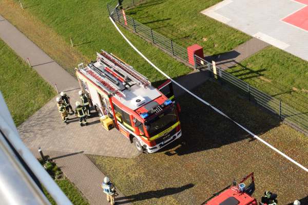Für die Feuerwehr, so erklärte Übungsorganisator Hauptbrandmeister (HBM) Julian Kipp der gemeinsam mit dem Christian Volmer, HBM, Stadtbrandinspektor Tim Buddeberg und Brandinspektor Marko Kötter die Übung in wochenlanger Arbeit mit dem Krankenhaus vorbereitet hatte, wurde der Einsatz der Drehleiter getestet, die Aufstellflächen und Zufahrten für die Feuerwehrfahrzeuge wie auch die Wasserversorgung geprüft.