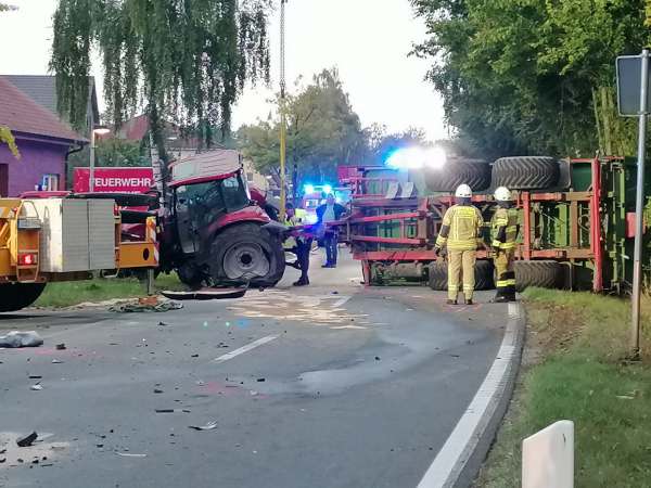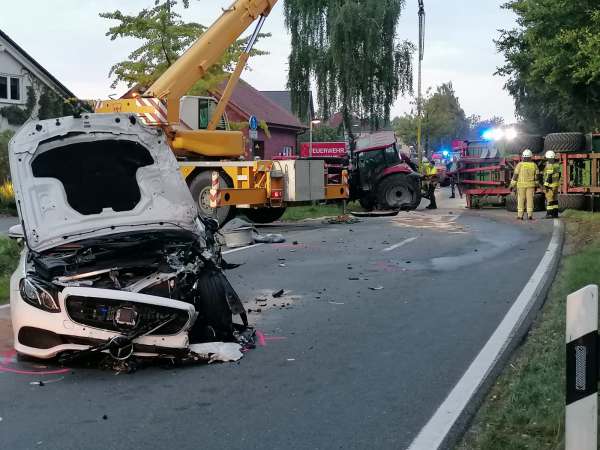 Sowohl das landwirtschaftliche Gespann als auch das beteiligte Fahrzeug waren nicht mehr fahrbereit und mussten abgeschleppt werden. Der Halter des Traktors kümmerte sich vor Ort um die Sicherung des Ernteguts.