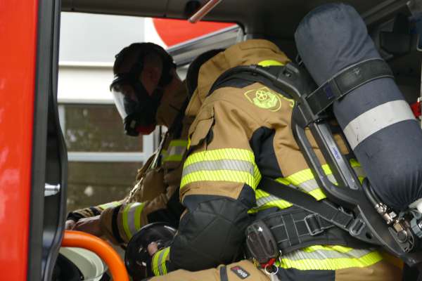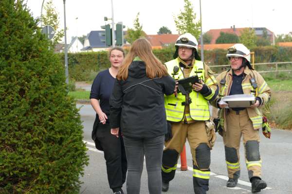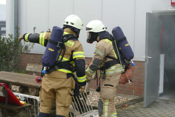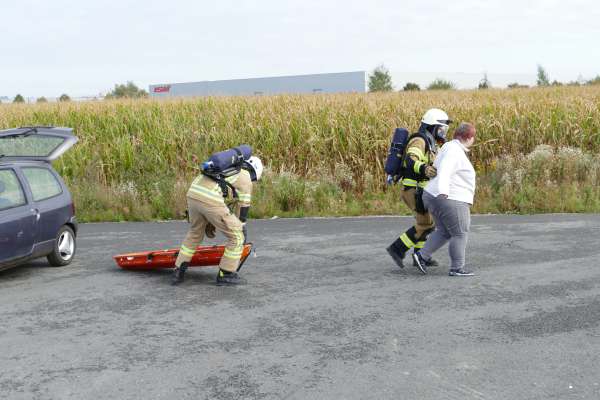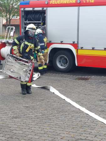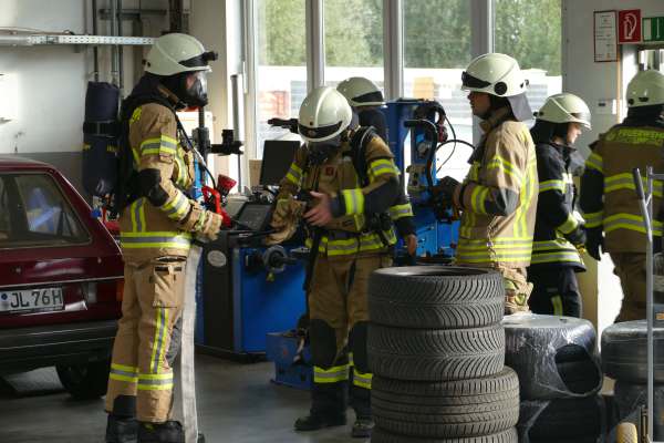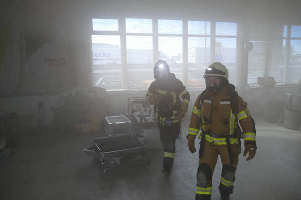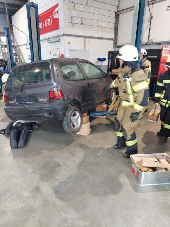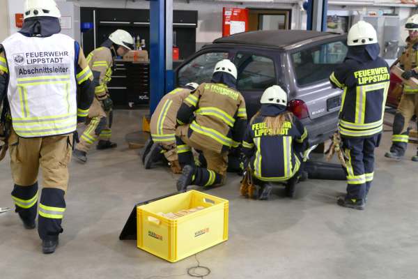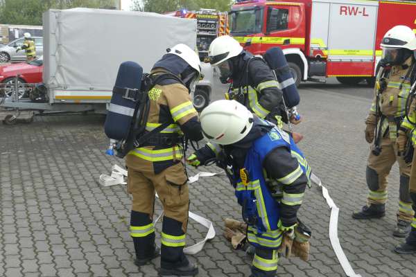 Mit der Meldung, Verpuffung In einer Lackiererei, die Halle steht in Flammen, Personen werden noch vermisst, hatte der Übungstag begonnen. Bereits auf der Anfahrt erfolgte dann die nächste Meldung, dass in der Werkstatt nebenan ein Pkw von einer Hebebühne auf eine Person gefallen ist. Für Einsatzleiter Tim Buddeberg eine Herausforderung, mussten doch beide Einsätze zeitgleich bearbeitet werden. Die Sicherung des PKW und die Sofortrettung der Person wie auch die Suche und Rettung der vermissten Personen in der vernebelten Halle und der Aufbau einer umfangreichen Wasserversorgung mit Riegelstellung waren die ersten Aufgaben der Einheit.