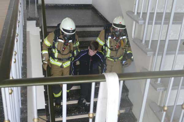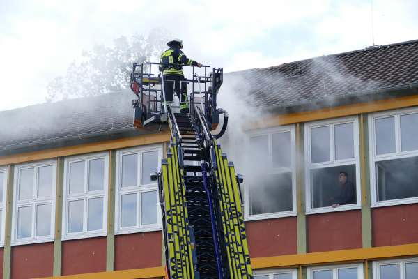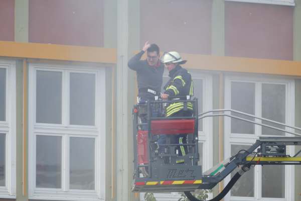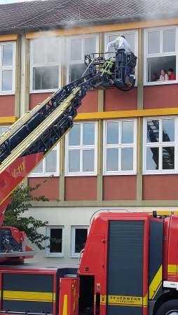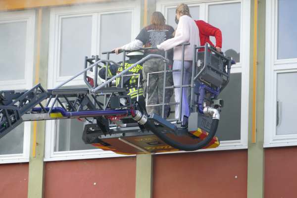 Dramatische Bilder am späten Nachmittag beim Ev. Gymnasium. Rauch quillt aus den Fenstern im dritten Geschoß, ein ohrenbetäubender Sirenenton und Lautsprecherdurchsagen fordern zur Evakuierung des Gebäudes auf. Schüler stehen an den Fenstern und rufen um Hilfe.