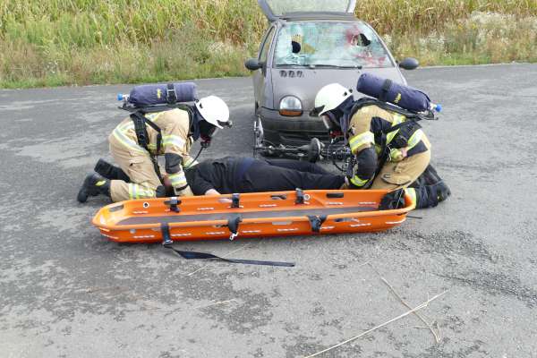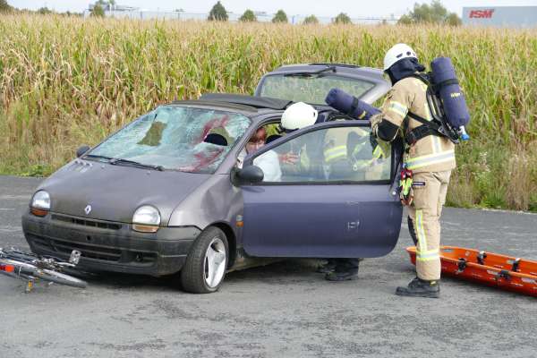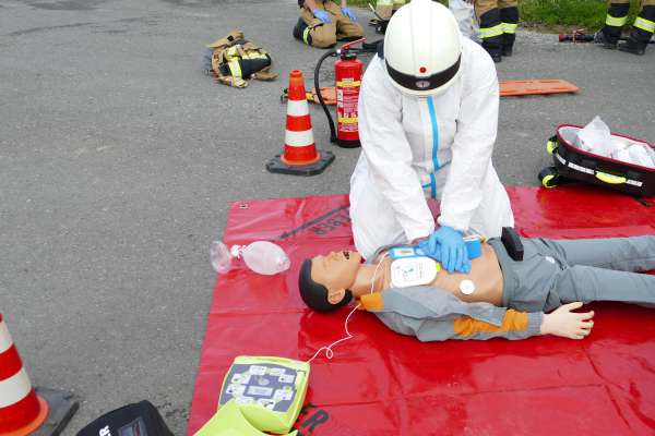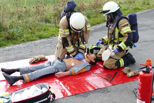 Ein Unfall mit Gefahrgut, dazu eine Reanimation und mehrere betroffene Personen waren die Herausforderung bei der der nächsten Übung. Hier war ein mit Gefahrgut beladener PKW und ein Fahrrad kollidiert. Da gefährliche Stoffe ausgetreten waren, musste eine Sofortrettung unter Atemschutz und eine anschließende Reanimation an einer Puppe mit dem AED durchgeführt werden. Gleichzeitig wurde eine Not Dekon aufgebaut und die Einsatzstelle abgesichert.