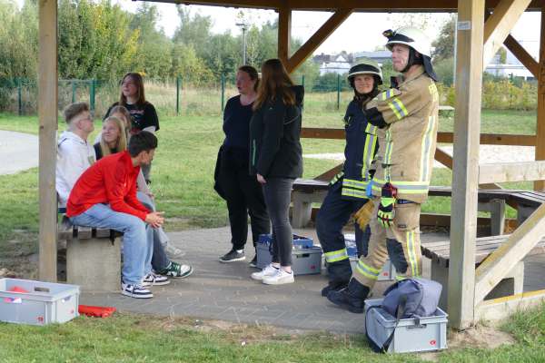 Die Feuerwehr bedankt sich bei der Firma KFZ Herre und der Lackiererei Lippmann, wie auch dem Ev. Gymnasium für die Gelegenheit hier zu üben. Ein besonderer Dank geht an die Hausmeisterin des EG Jutta Lautsträter (Begleitung am Objekt), Markus Lautsträter, (Nebelmaschinen), dem THW Lippstadt (Technik), der Autoverwertung Sicking, (Unfallfahrzeug), Gisela König Dreier und dem Versorgungsteam der Kameraden der Ehrenabteilung, (Frühstück und Mittagessen) für ihre Unterstützung. Ein herzliches Dankeschön geht an die DRK Gruppe Warstein und an die Schülerinnen und Schüler des EG, die sich als Darsteller aus dem vernebelten Gebäude mit der Drehleiter retten ließen.