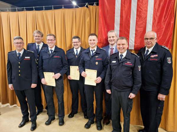 Der Leiter der Feuerwehr David Westerfeld und die beiden stellv. Leiter der Feuerwehr Jan Rhäsa und Bernd Peterburs, der Kreisbrandmeister Thomas Wienecke sowie Bürgermeister Alexander Tschense gratulierten den Kameraden.
