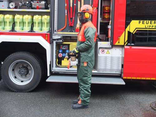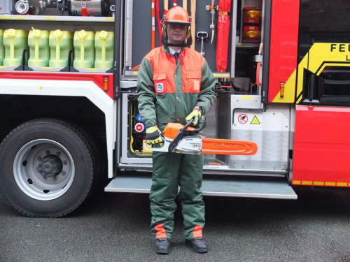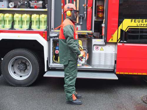 Der Waldarbeiterschutzanzug wird bei der Feuerwehr Lippstadt bei Sturmeinsätzen, insbesondere bei Arbeiten an umgestürzten Bäumen und abgeknickten, bzw. abgebrochenen, Ästen in Zusammenhang mit Motorsägen vom Feuerwehrmann getragen. Der Waldarbeiterschutzanzug besteht aus: dem Waldarbeiterschutzhelm mit Gesichtsschutz und Drahtgefelchtschirm und Kapselgehörschutz der Waldarbeiterjacke der Waldarbeiterlatzhose welche mit einer eingenähten, großen KWF-geprüften Schnittschutzeinlage (bis in den Bauchbereich) augestattet ist. Diese Schnittschutzeinlage verhindert Verletzungen, falls die Kettensäge abrutscht und z.B. auf das Bein aufschlägt. Durch die faserige Einlage blockiert die Kette und stoppt.