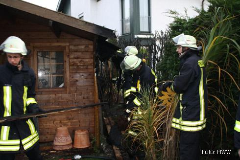 Heiße Asche in einer Mülltonne setzten die Mülltonnen und eine Hecke in Brand. Das Feuer drohte auf ein Gartenhaus überzugreifen. Durch das beherzte Eingreifen von Anwohnern mittels zweier Gartenschläuche konnte das Feuer vor Eintreffen der Feuerwehr abgelöscht werden. Nachlöscharbeiten erfolgten mit dem Schnellangriff des LF 10/6. Anschließend wurde die Dachpappe und die verbrannten Dachbretter entfernt. Nach dem alle Glutnester abgelöscht waren, wurde die Einsatzstelle an die Eigentümerin übergeben.
