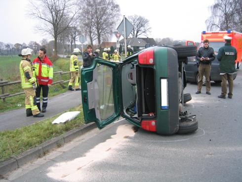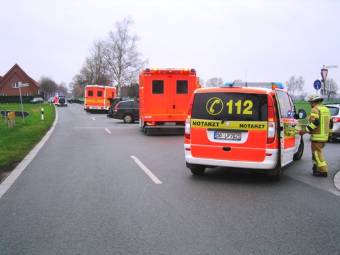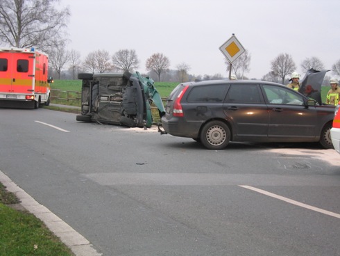 Schwerer Verkehrsunfall im Kreuzungsbereich Lambertweg / Liesborner Straße. Dass zwei Personen eingeklemmt waren, bestätigte sich bei Eintreffen der Rettungskräfte nicht.