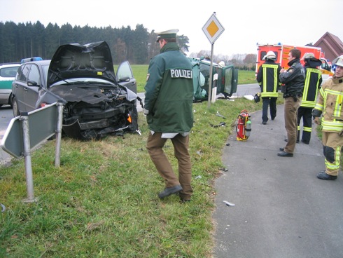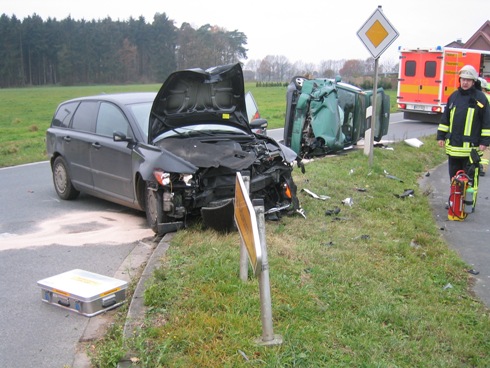 Bei dem Verkehrsunfall zwischen zwei PKW wurden drei Personen verletzt. Durch die Feuerwehr wurde der Brandschutz sichergestellt und ausgelaufene Betriebsstoffe mittels Bindemittel abgestreut.