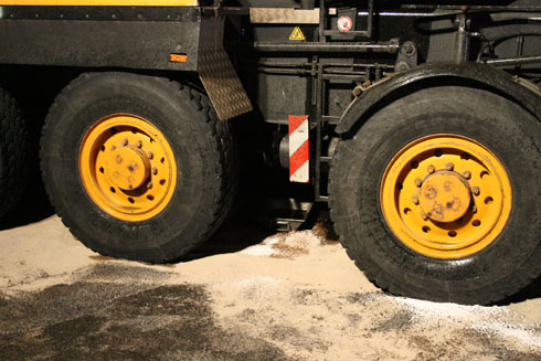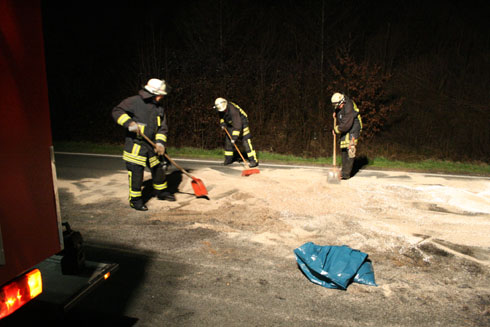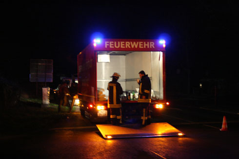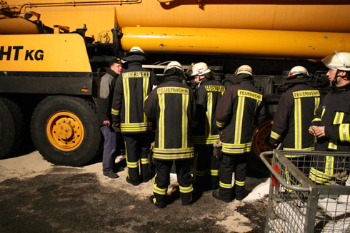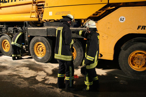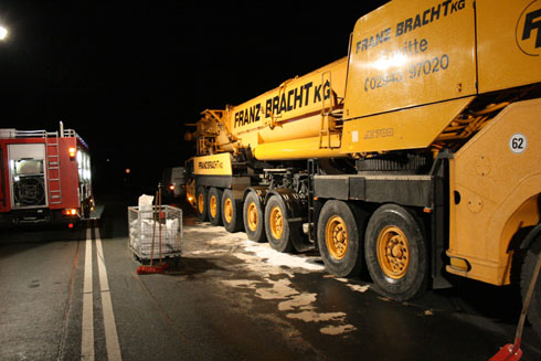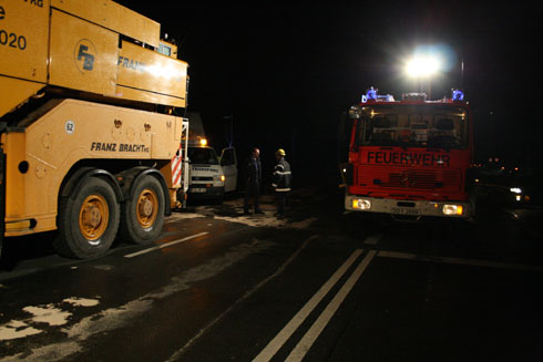 Durch einen Getriebedefekt an einem 110-Tonnen-Kran lief im Kreuzungsbereich B 55 / Ostlandstraße Getriebeöl aus. Der ausgelaufene Betriebsstoff wurde von der Feuerwehr abgestreut. Der Kran wurde von einem anderen Kran abgeschleppt. Danach wurde das verbrauchte Bindemittel durch eine Kehrmaschine wieder aufgenommen. Warnschilder wurden aufgestellt. Der Kreuzungsbereich war in der Zeit von 22.00 - 23.30 Uhr für den Verkehr voll gesperrt.