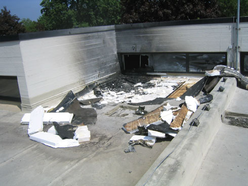 Auf einem Flachdach einer Schule brannte eine ca. 2 m² große Fläche der Dachhaut. Ein Oberlichtfenster war schon von der Wärmestrahlung geplatzt. Der Brand wurde abgelöscht. Zur Kontrollzwecken wurde die Dachhaut geöffnet. Ein Klassenzimmer wurde mittels Hochleistungslüfter quergelüftet.