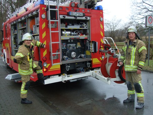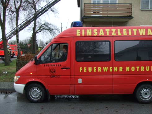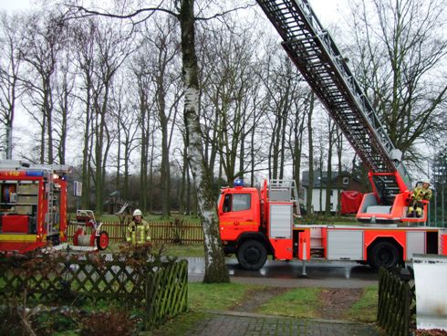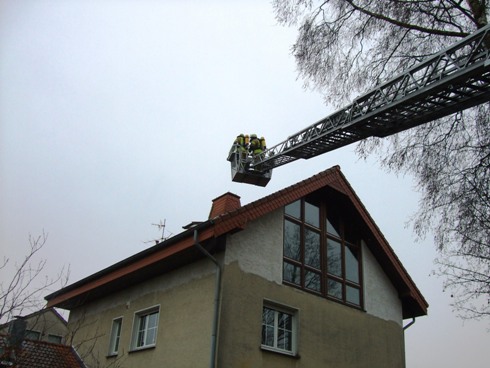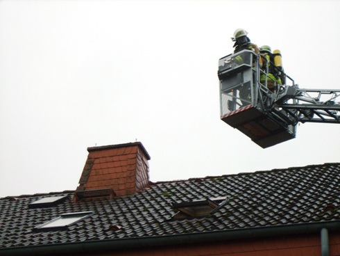 Kaminbrand in einem Wohngebäude. Da sich die zuständige Bezirksschornsteinfegermeisterin in der Nähe befand, stieg sie direkt in den Korb der Drehleiter und fegte den Schornstein des Wohngebäudes.
