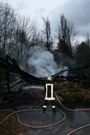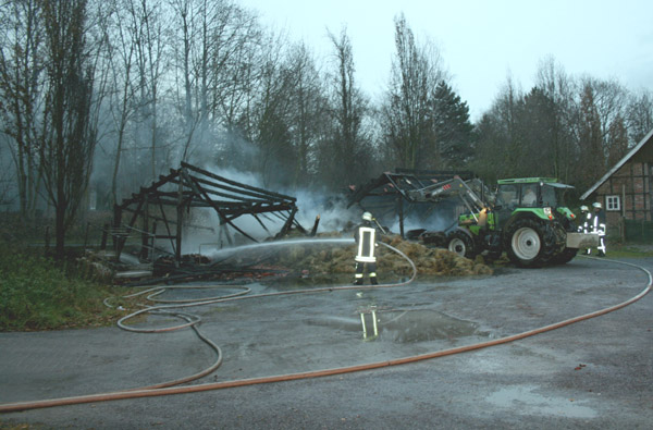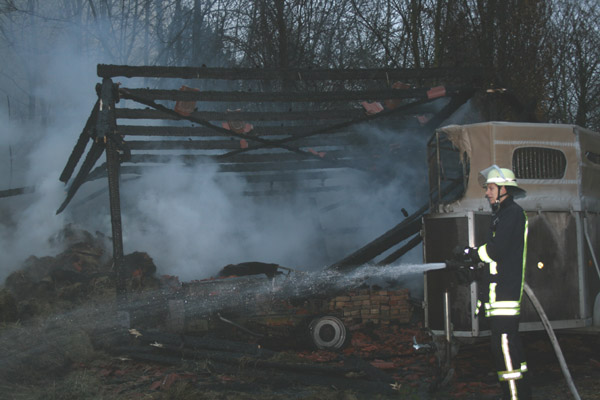 Bei Eintreffen der Feuerwehr brannte eine kleine Scheune in voller Ausdehnung. Zur Brandbekämpfung wurden zwei C-Rohre unter Atemschutz eingesetzt. Die Strohballen konnten mit einem Traktor auseinander gezogen werden. Danach wurde das Stroh und weitere Brandnester abgelöscht.