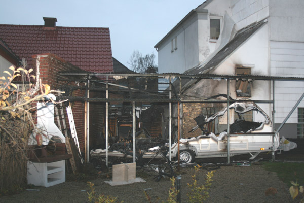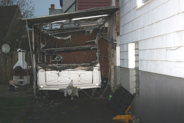 An einem Wohnhaus brannte eine Gartenlaube, ein Carport und ein darunterstehender Wohnwagen in voller Ausdehnung. Zur Brandbekämpfung wurden drei Trupps unter Atemschutz mit drei C-Rohren eingesetzt. Nach der Brandbekämpfung wurde der Bereich mittels Wärmebildkamera kontrolliert.