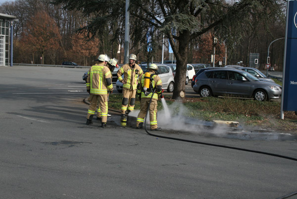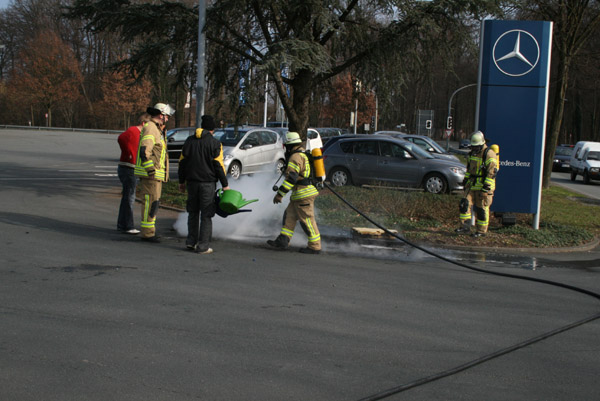 Erste Löschversuche wurden von dem Fahrer und dem Beifahrer unternommen, indem volle Gießkannen vom benachbarten Hauptfriedhof kurzerhand zur Hilfe genommen wurden.
