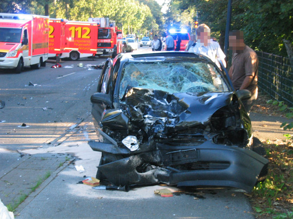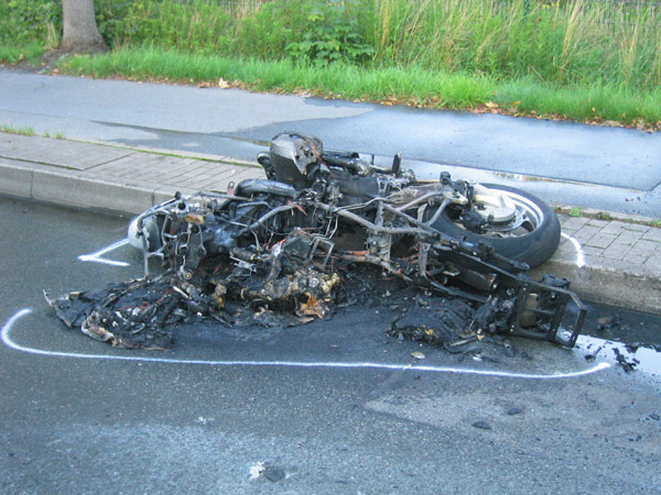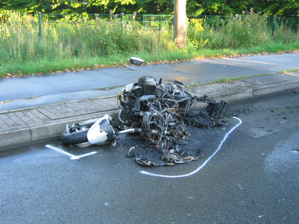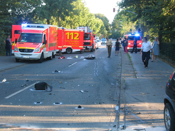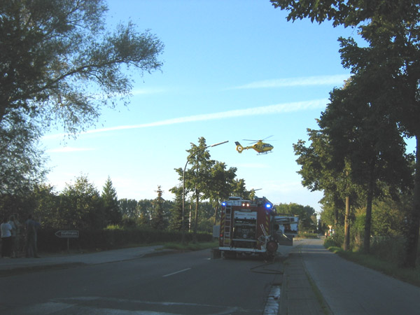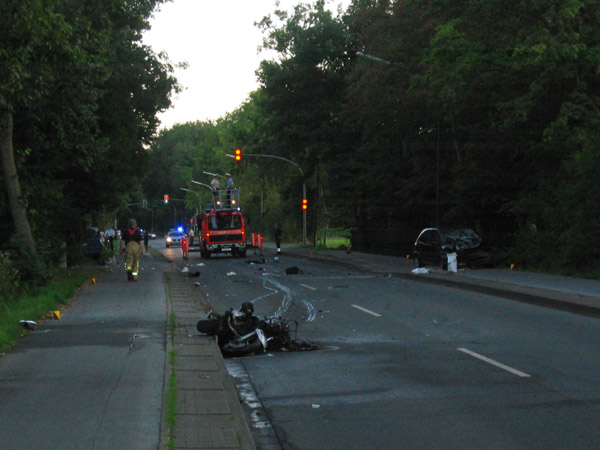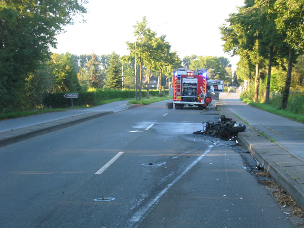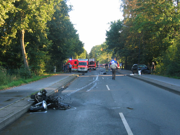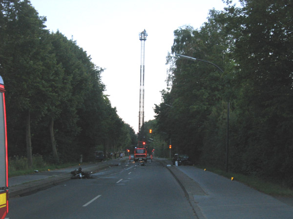 Schwerer Verkehrsunfall zwischen einem Motorrad und einen PKW. Der Rettungsdienst wurde über das Stichwort MANV I (Massenanfall von Verletzten / 3 - 4 verletzte Personen) alarmiert. Bei Eintreffen der Feuerwehr brannte das Motorrad in voller Ausdehnung. Der Brand wurde von einem Atemschutztrupp abgelöscht. Die Feuerwehr unterstützte den Rettungsdienst bei der Versorgung von drei schwer verletzten Personen.