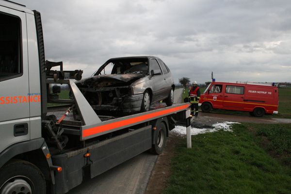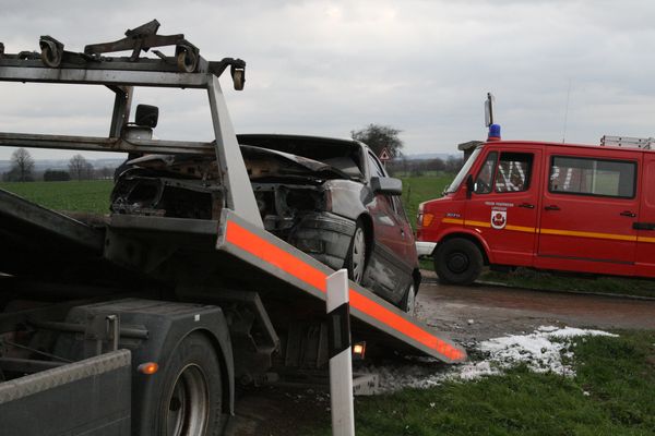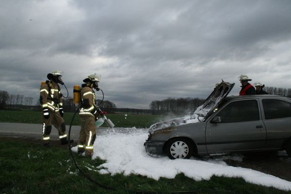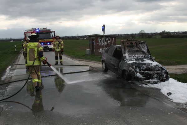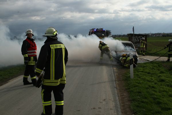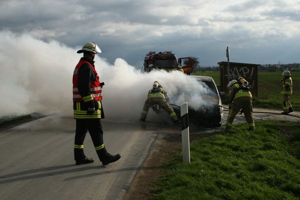 Bei Eintreffen der Feuerwehr brannte ein Pkw im Motorraum in voller Ausdehnung. Die Motorhaube wurde geöffnet. Der Brand wurde mittels Schaumpistole von einem Trupp unter Atemschutz abgelöscht.