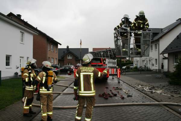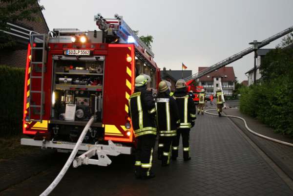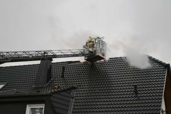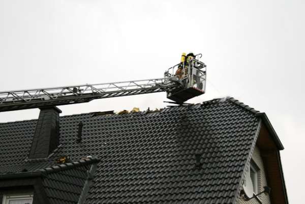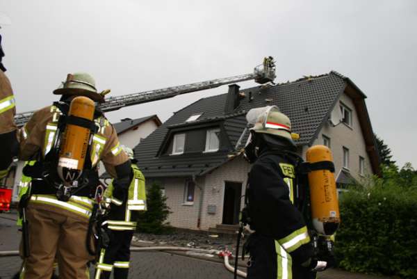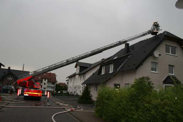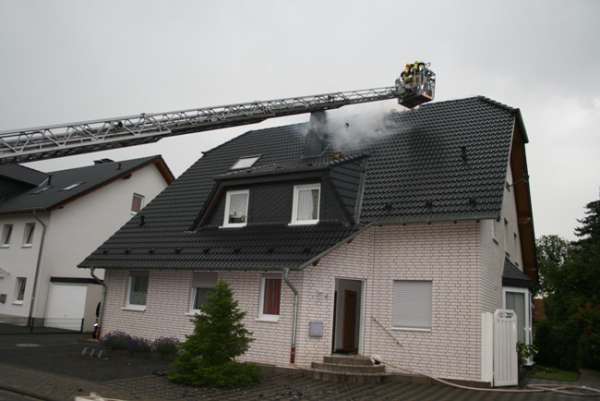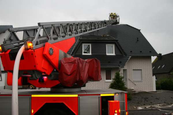 Dachstuhlbrand nach Blitzeinschlag. Im Bereich vom Dachfirst waren bei Eintreffen der Feuerwehr Flammen zu sehen. Über den Korb der Drehleiter wurde von einem Trupp unter Atemschutz die Dachhaut geöffnet. Die Flammen wurden mit einem C-Rohr abgelöscht. Im Innenangriff wurden zwei Trupps unter Atemschutz mit einem C-Rohr eingesetzt. Bei dem Einsatz gab es keine verletzten Personen.