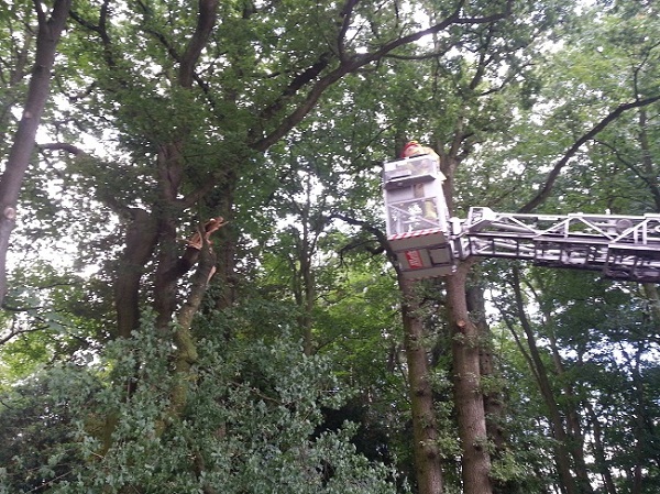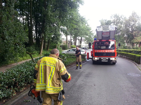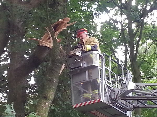 Über die Drehleiter wurde ein Ast aus einem Baum entfernt, der auf den Gehweg zu stürzen drohte.