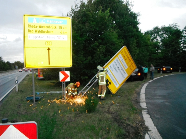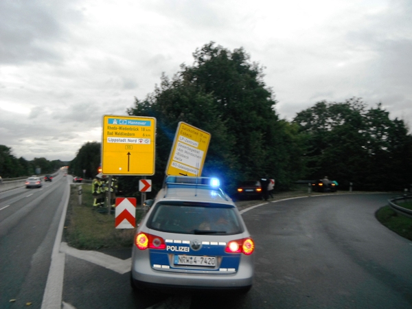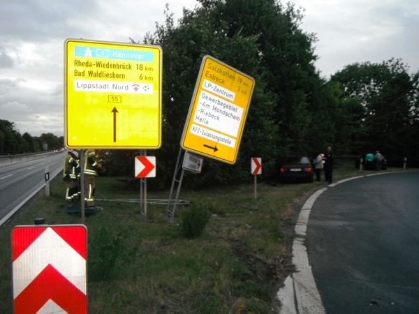 In der Ausfahrt der B 55 zur Rixbecker Straße in Fahrtrichtung Rheda-Wiedenbrück war von einem Pkw ein Wegweiser beschädigt worden. Da der Wind stürmisch war wurde das Schild auf Anordnung der Polizei abgeflext.