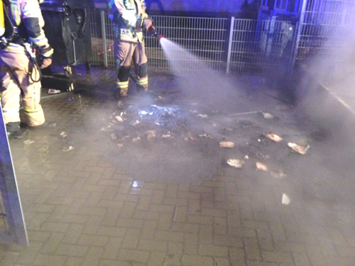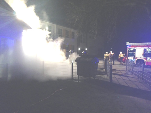 Bei Eintreffen der Feuerwehr brannte ein Müllcontainer auf dem Gelände einer Grundschule. Zur Brandbekämpfung wurde ein Trupp unter Atemschutz mit dem Schnellangriff eingesetzt.