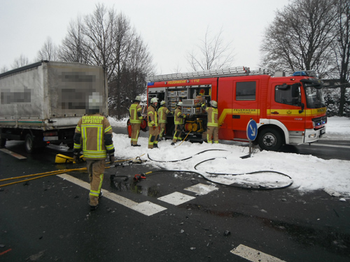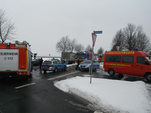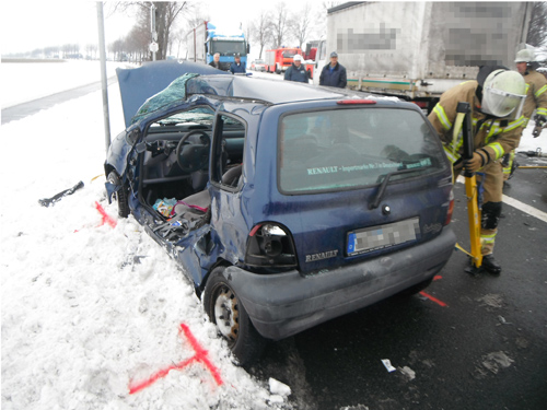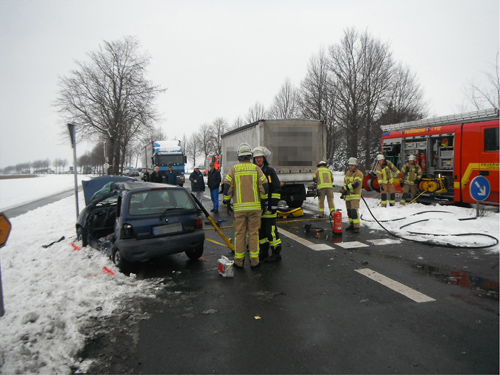 Schwerer Verkehrsunfall zwischen einem Pkw und einem Lkw im Kreuzungsbereich Rüthener Straße / Puisterweg. Die Pkw-Fahrerin wurde im Fahrzeug eingeklemmt und musste von der Feuerwehr mittels hydraulischen Rettungsgeräten befreit werden. Der Brandschutz wurde mit zwei unabhändigen Löschmitteln sichergestellt. Die Fahrzeugbatterie wurde abgeklemmt. Aufgrund der schweren Verletzungen verstarb die Pkw-Fahrerin noch an der Einsatzstelle. Durch die Polizei wurde eine Vollsperrung veranlasst.