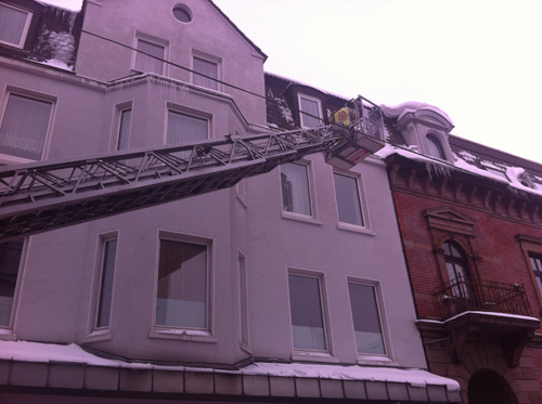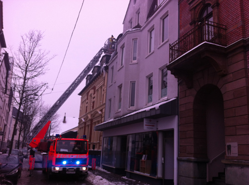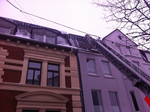 Eiszapfenbeseitigung über den Korb der Drehleiter an zwei Wohngebäuden. Für die Dauer des Einsatzes war die Cappelstraße gesperrt worden.