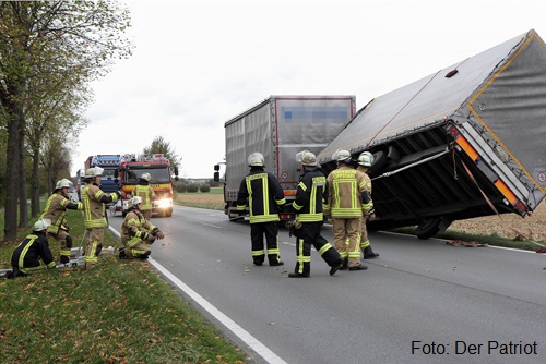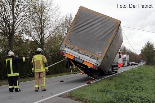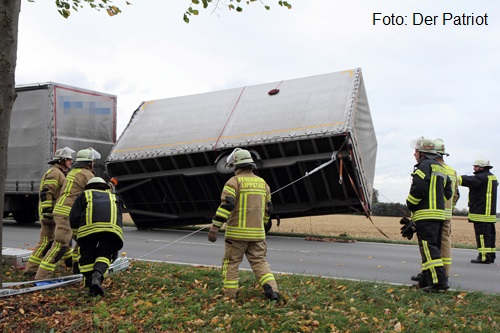 Ein Lkw-Anhänger drohte umzustürzen. Ursache war eine Schlagseite durch eine Sturmböe. Der Anhänger war gering beladen. Die Feuerwehr sicherte den Anhänger mit Stahlseilen und stellte das Gefährt wieder auf die Räder. Das Lkw-Gespann konnte nach einer Kontrolle zusammen mit der Polizei im nahegelegenen Gewerbegebiet „Am Wasserturm“ die Fahrt fortsetzen.