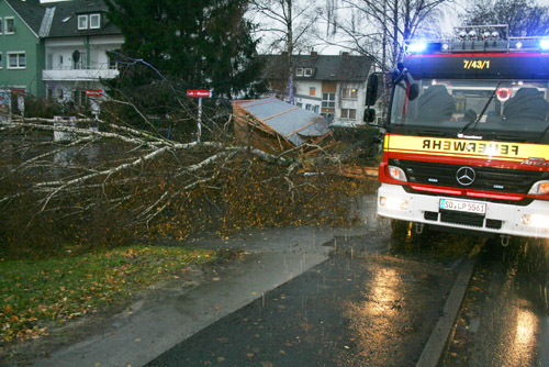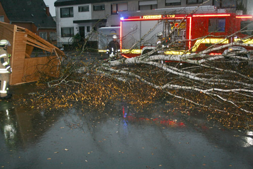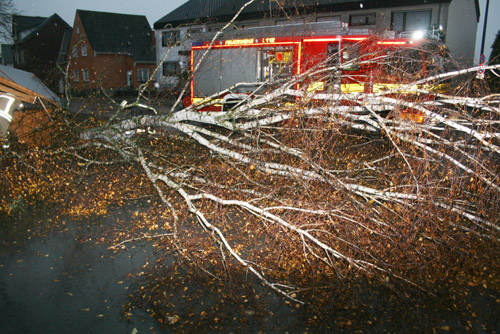 Das Orkantief "Xaver" entwurzelte einen Baum. Dieser stürzte auf eine Holzhütte, beschädigte einen Jägerzaun und versperrte anschließend die Einfahrt zu einer Tankstelle. Die Reste der Holzhütte wurden zur Seite geräumt. Der Baum wurde mittels Kettensäge zerkleinert und die Reste wurden ebenfalls zur Seite geräumt.