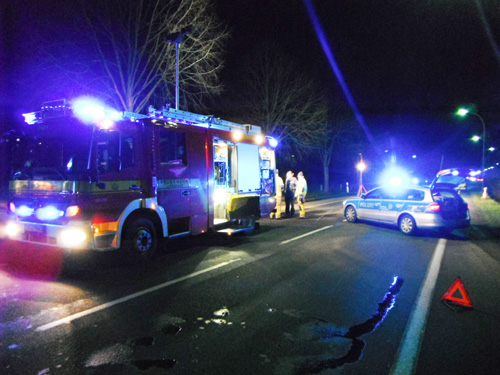 Ausleuchten einer Einsatzstelle im Bereich vom Kreisverkehr Wiedenbrücker Straße / Ostlandstraße zur Unfallaufnahme durch die Polizei nach einem Verkehrsunfall zwischen einem Pkw und einem Fußgänger.
