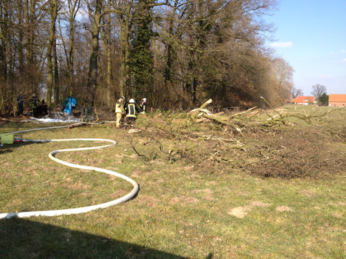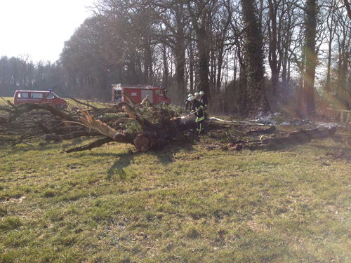 Bei Eintreffen der Feuerwehr brannt eine ca. 18 m hohe und hohle Eiche bis zu einer Höhe von ca. 10 m wie eine Fackel. Da die Wiese nicht befahrbar war wurde das geländegängige TLF 8/18 der Löschgruppe Lipperode nachgefordert. Die Eiche wurde gefällt und mittels C-Rohr abgelöscht. Ein Kettenbagger eines Unternehmers war zufällig in der Nähe und unterstützte die Arbeiten der Feuerwehr.