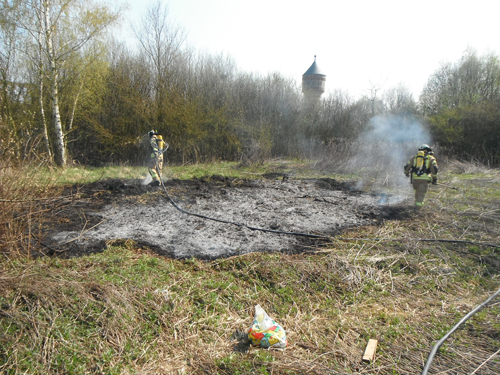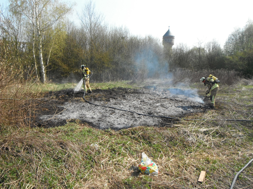 Bei Eintreffen der Feuerwehr brannten etwa 20 qm² Buschwerk. Erste Löschversuche waren bereits durch die Polizei mit Feuerlöschern eingeleitet worden. Mit dem Schnellangriff wurde der Brand von der Feuerwehr abgelöscht.